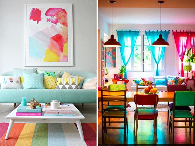 Essa ideia é sensacional para você que quer um ambiente mais despojado e descontraído, com um belo tom alegre, e veja só como não é necessário pintar nenhuma parede, basta você usar um tapete lindo e colorido ou outros detalhes. Liberte sua imaginação, o colorido traz alegria para o ambiente, mas cuide para não exagerar na dose.