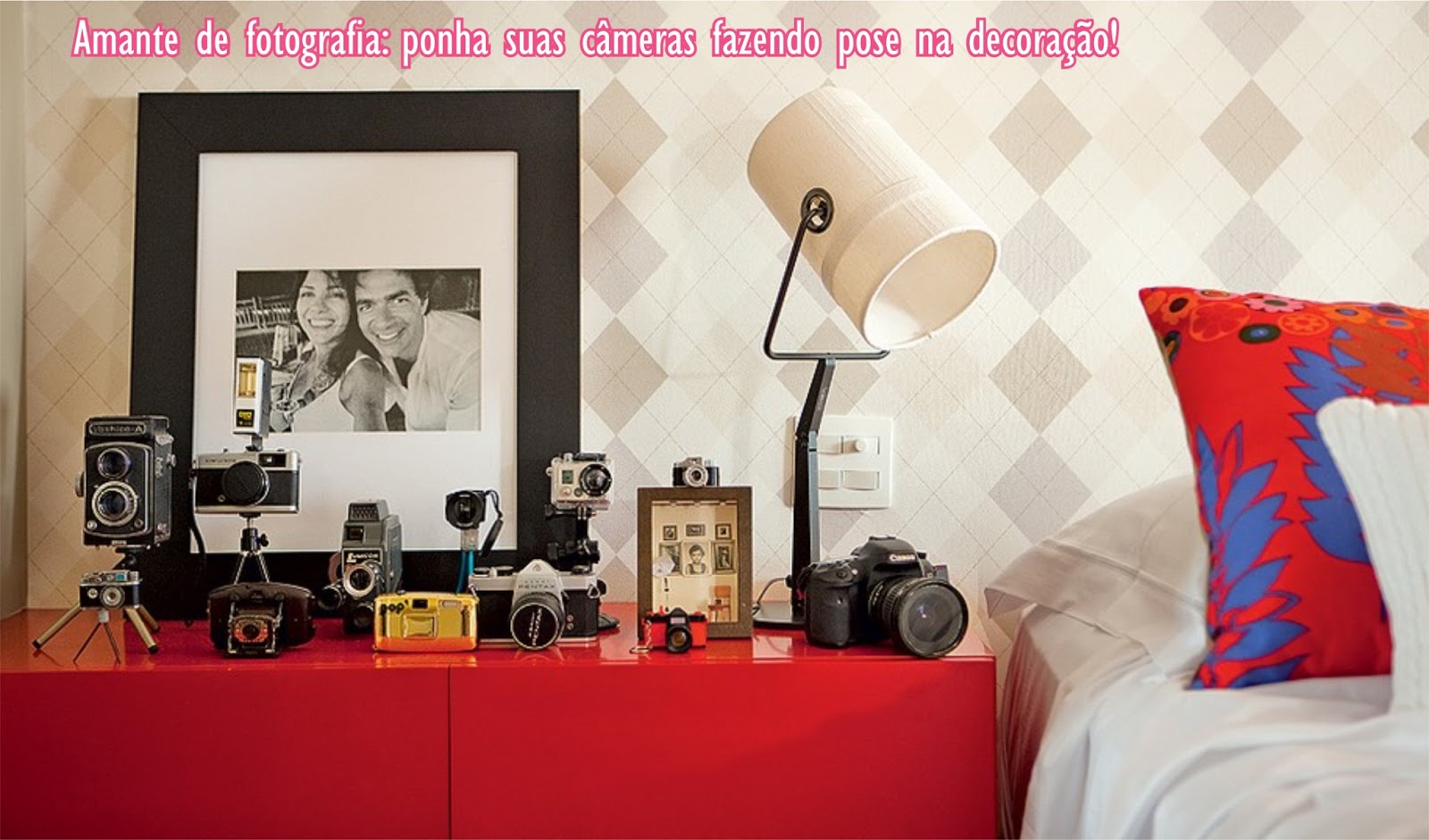 Dica 5: eu sou suspeita para falar, adoro fotografia e tudo que envolva o assunto! Acho muito legal expor as câmeras antigas, olha quanta opção existe! Mas claro, você pode expor outro tipo de coleção, por exemplo, velas, caixinhas, etc. Use sua imaginação, tudo pode se tornar objetivo decorativo. Temos que aprender a mudar nosso olhar, ver beleza e possibilidade em outros objetos. Se você gosta muito de sua profissão, dê um jeito de expor coisas relacionadas ao seu trabalho. Exponha certificados, fotos de quem te inspira, objetos que já não usa mais, etc. Exemplo: é jornalista? Exponha a máquina de escrever que você não usa mais e junto com ela recortes de jornais que sairam suas matérias, fotos do início da carreira, etc.
