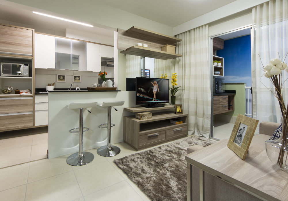 Se o espaço é pequeno, o ideal é usar móveis claros ou tudo branco, tanto na cozinha como na sala. Se usar algo detalhe tom de madeira na sala, por exemplo, use-o na cozinha também. Os eletrodomésticos também devem estar em bom estado e, de preferência, ser tudo igual (ou tudo branco, tudo de inox, etc). Uma dica para quem quer eletrodoméstico de inox é investir no contact metálico, o resultado fica perfeito.