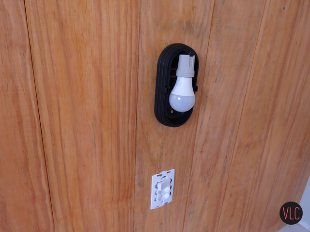 6. Na parte das tomadas, puxamos elas pra frente e instalamos aquelas luminárias de jardim, estilo tartaruga.