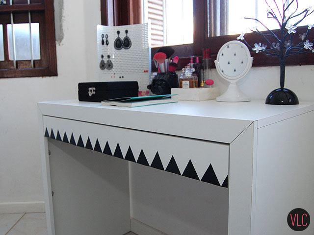 Aproveitei que sobrou triângulos e apliquei na gaveta da penteadeira. Minha penteadeira foi para a janela e decidi não fazer mais o espelho de camarim, afinal eu sei que eu não iria me sentar ali para se maquiar (Sejamos sinceros!). A árvore de luz deu um toque tão gostos à noite…. Se você reparar, esta parede da janela está bem detonada, ainda preciso dar uma atenção à ela…