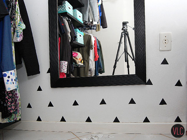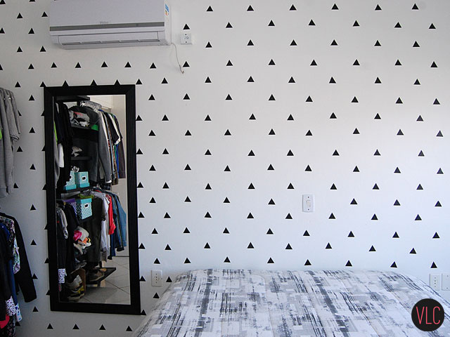 Esqueci de colocar as almofadas na cama para a foto! rsrs Finge que tem umas almofadas ali. E também vou colocar uns quadrinhos nesta parede, ainda estou vendo quais. Bom, o passo a passo é bem simples, usei papel contact preto fosco (o mesmo que usei na minha cozinha), régua, caneta e um molde de triângulo de 5 cm. Para agilizar fiz o seguinte: fiz um triângulo do lado do outro e, para aproveitar o espaço, tracei um risco com a régua e assim surgiram também triângulos de cabeça para baixo. Fácil, né?!