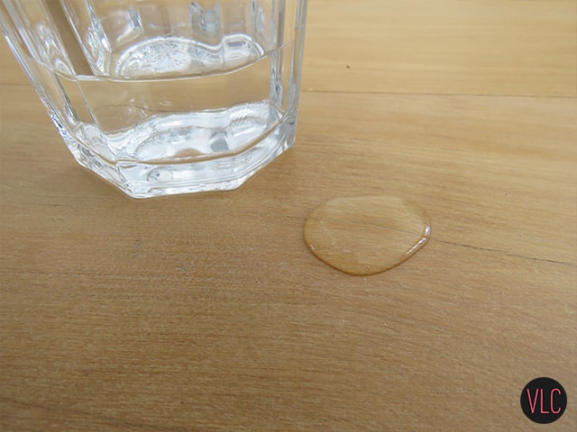 Quero dizer que estes 2 testes são bem simples mas que se a mesa não estivesse protegida com o Vedaspray seriam marcas muito difíceis de retirar, mesmo a pequena gota pois como a mesa não tinha nenhum produto, a água acabava penetrando na madeira.
